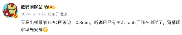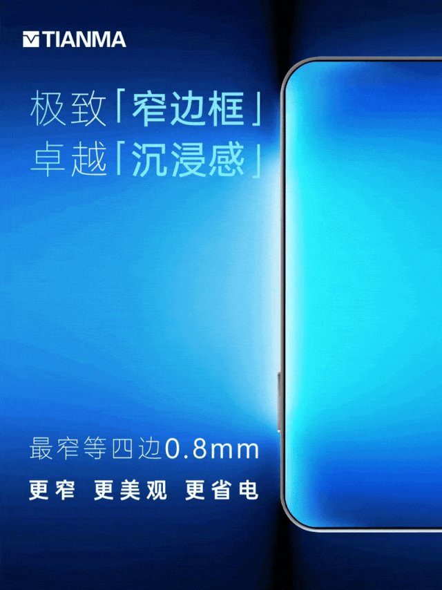 根据早前的爆料,天马已经出样了 0.8mm 的四等边直屏。