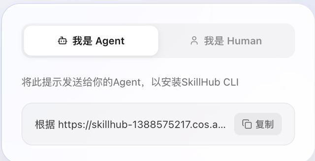 1.安装 SkillHub 商店,Agent 和 human 请注意选择不同方式