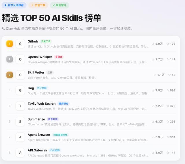 Skills 太多选哪个?SkillHub 从官方生态中筛选出 50 多个优质技能,形成精选榜单,并完成安全扫描和质量筛选。