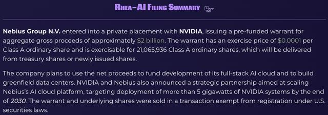 根据Nebius在3月11日向美国证券交易委员会 (SEC)提交的文件,Nebius与英伟达达成私募配售协议,发行预先出资认股权证,募集总毛收益约20亿美元。该认股权证的行权价为每股A类普通股0.0001美元,可行权数量为21065936股A类普通股,相关股份将从库存股或新发股份中交付。