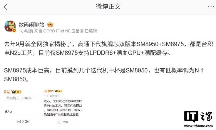 根据该博主此前的爆料,高通下代旗舰芯双版本 SM8950+SM8975,都是台积电 N2p 工艺,目前仅 SM8975 支持 LPDDR6+ 满血 GPU+ 满配缓存。其中,高通 SM8975 成本巨高,目前摸到几个迭代机中杯是 SM8950,也有低概率调为 N-1 SM8850(骁龙 8 Elite Gen 5)。