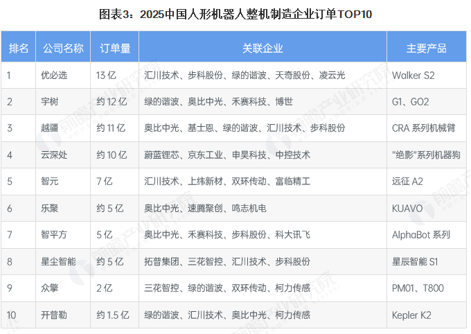 从人形机器人整机制造企业获得的订单规模来看,截至2025年11月,优必选以高达13亿的订单量位居行业榜首,主推产品为Walker S2;宇树以约12亿的订单量紧随其后;越疆则凭借CRA系列工业协作机械臂,成为工业场景人机协作的主力机型,订单量约11亿元,位居行业第三。