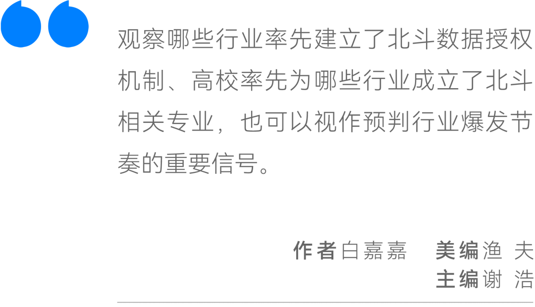 从以上角度出发,哪些行业率先建立了北斗数据授权机制、高校率先为哪些行业成立了北斗相关专业,也可以视作预判行业爆发节奏的重要信号。