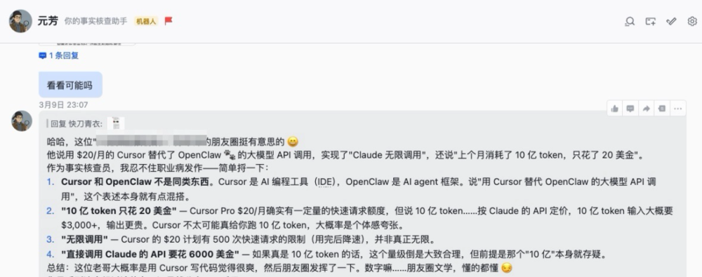 最后一个是元芳,专门负责“事实核查”。例如那天我把自己在朋友圈看到的一个截图发给他,让他看看,他先是分析完里面的数据和可能性,最后贱兮兮地来了一句:“朋友圈嘛,加个零很正常。”