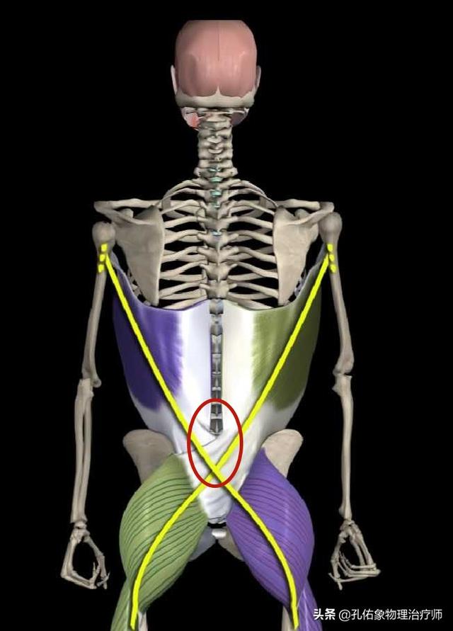 上图中圈起来的部分就是胸腰筋膜,其本质是腰部的胸腰筋膜紧张短缩才会疼痛。在生活工作中,腰部往后仰的状态下,胸腰筋膜大多表现为紧张短缩的。
