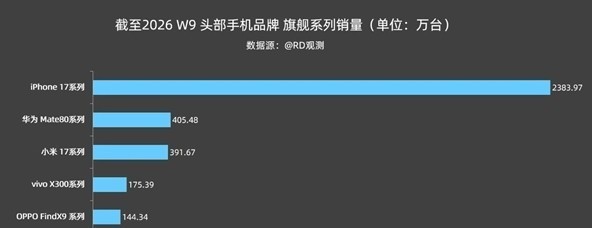 芯片出货量的巨大差距,直接反映了终端手机的市场表现。长期关注国内手机市场份额的博主“RD观测”发布的数据显示,截至2026年第9周,苹果iPhone 17系列在中国市场的销量约为2383.97万台,断崖式领跑各品牌旗舰机型,苹果iPhone 17系列销量远超第二名至第六名总和。