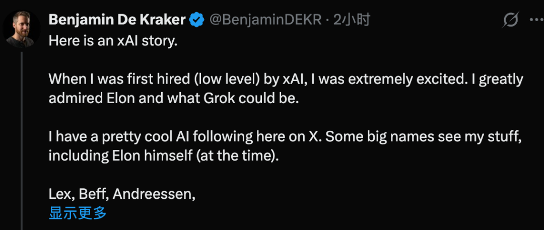 不过,最近也有一名叫Benjamin De Kraker的前员工爆料,说所谓的扁平文化都是幌子,xAI是他见过官僚主义最严重的地方。