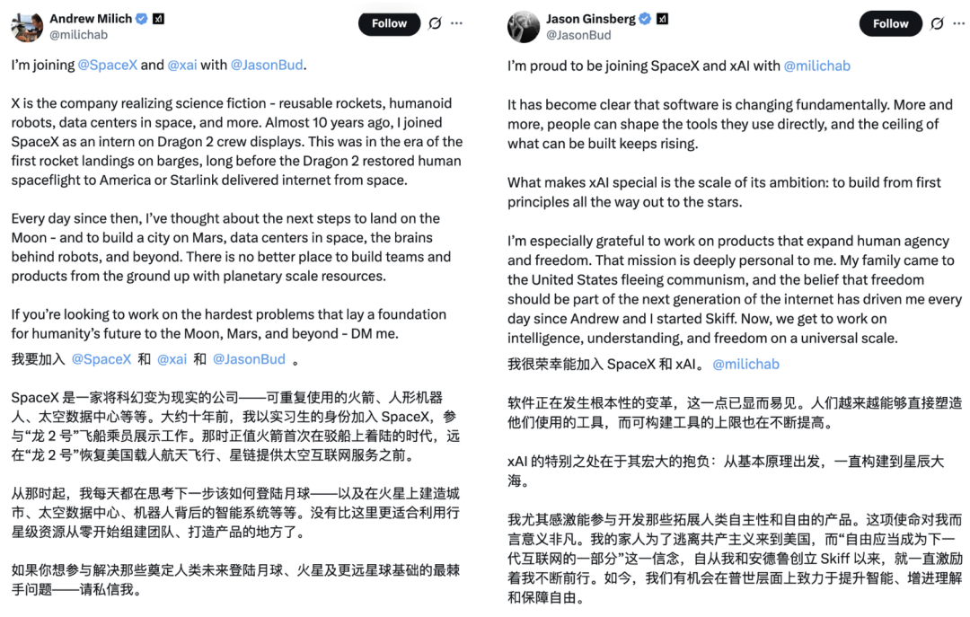 官宣推文上,Milich和Ginsberg解释了各自加入SpaceX和xAI的原因。