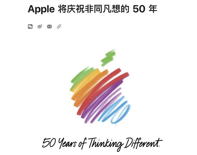 标题“50 Years of Thinking Different”,与苹果1997年的经典广告语“Think Different”相呼应。