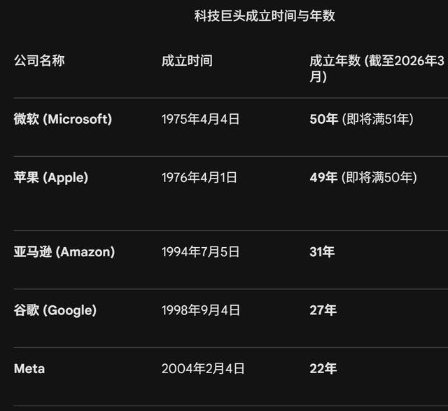 值得一提的是,在美国头部科技巨头中,微软成立时间是1975年4月4日,比苹果“大一岁”,亚马逊、谷歌、Meta都“年轻”许多。