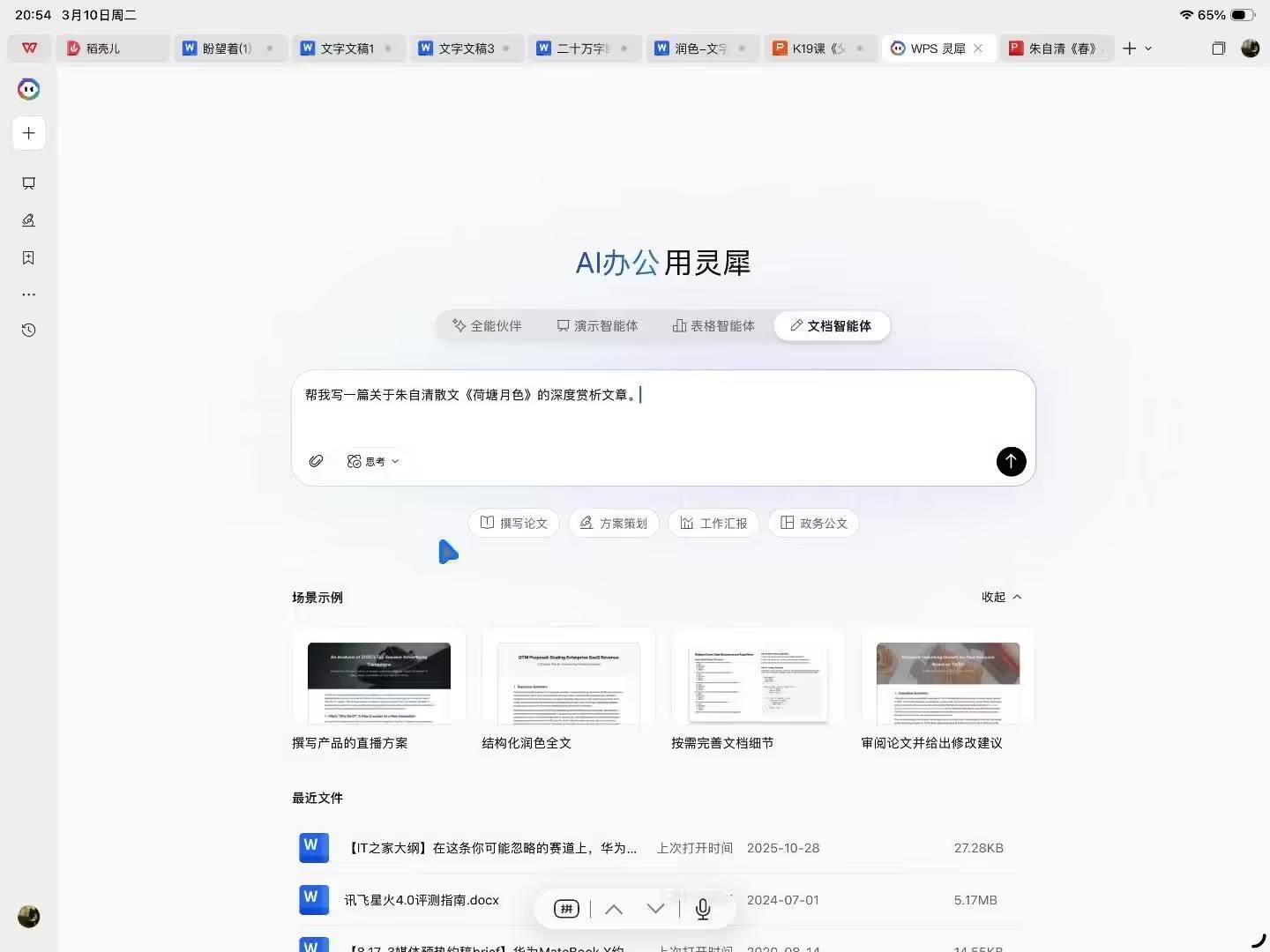 再比如文档创作方面,小编接着让 WPS 灵犀智能体帮我写一篇朱自清散文《荷塘月色》的深度赏析解读文章,灵犀智能体也很快帮我完成了一篇像模像样的解读文章,写完之后,还能直接创建文档,你可以用 WPS 灵犀智能体继续对文章按照你的想法进行修改。