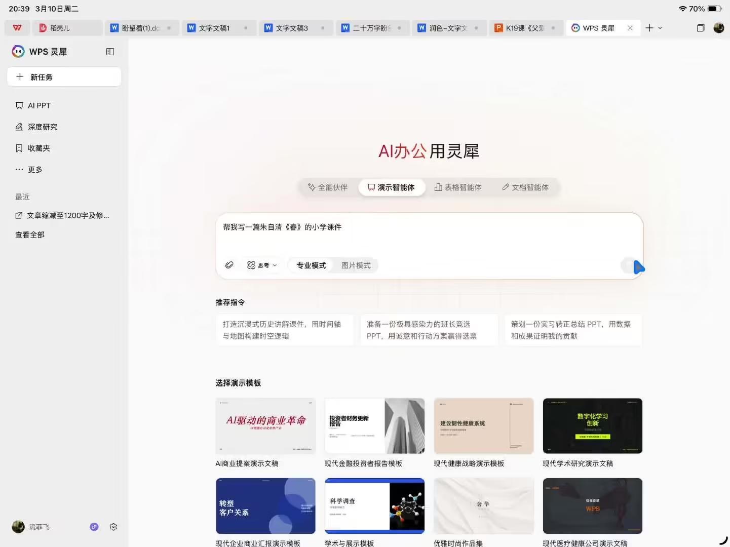 比如小编让 WPS 灵犀智能体帮我写一份朱自清散文《春》的教学课件,我只需对灵犀智能体说一句简单的指令,它就能帮我从 PPT 思路到文稿到大纲到成品,一口气完全做出来,并且整体效果很不错,整个过程只用了几分钟,比自己从头开始做快上数十倍。而小编只需要在此基础上修改就行了。在 iPad 上能够轻松完成这样的工作,放在过去确实是很难办到的。