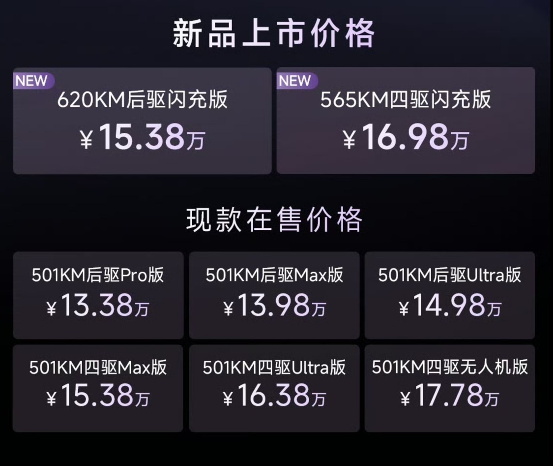 针对更高性能与复杂路况需求,565KM四驱闪充版在底盘与座舱硬件上进行了针对性升级。该版本增加了智能电四驱系统、iATS智能全地形识别及iTAC智能扭矩控制系统,并配备四活塞前定钳与19英寸熏黑轮毂。此外,四驱版本座舱内增配了智能冷暖冰箱、车内220V交流放电插座以及14扬声器帝瓦雷音响,在提升通过性的同时强化了驾乘体验。