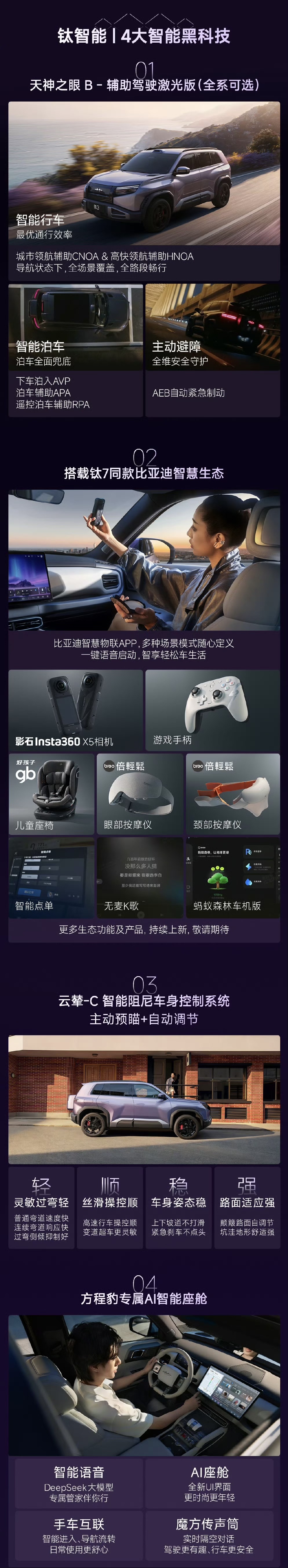 在核心技术与基础配置方面,钛 3 闪充版全系基于智能 EVO+ 平台打造,搭载比亚迪第二代刀片电池并采用CTB电池车身一体化技术。车辆标配比亚迪闪充技术、云辇-C+主动预瞄系统以及“天神之眼”辅助驾驶系统。座舱内部配备15.6英寸中控多媒体屏和12英寸W-HUD,提供AI智能座舱、前排座椅通风加热、方向盘加热及6kW对外放电等功能,同时保留了151L电动前备箱与车尾28L储物空间的物理拓展。