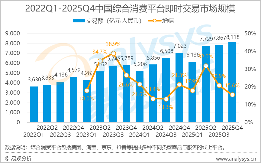 报告显示,2025年中国综合消费平台即时交易市场规模达到29852亿元,同比增长21.4%;其中2025年第四季度市场规模为8118亿元,同比增长15.6%,行业整体保持较快增长。报告分析认为,2025年第四季度,尽管进入秋冬季后饮料等外卖需求有所回落,但随着“双11”购物季的到来,促销热潮从传统电商延伸至即时交易场景,支撑了整体市场规模维持在较高水平。