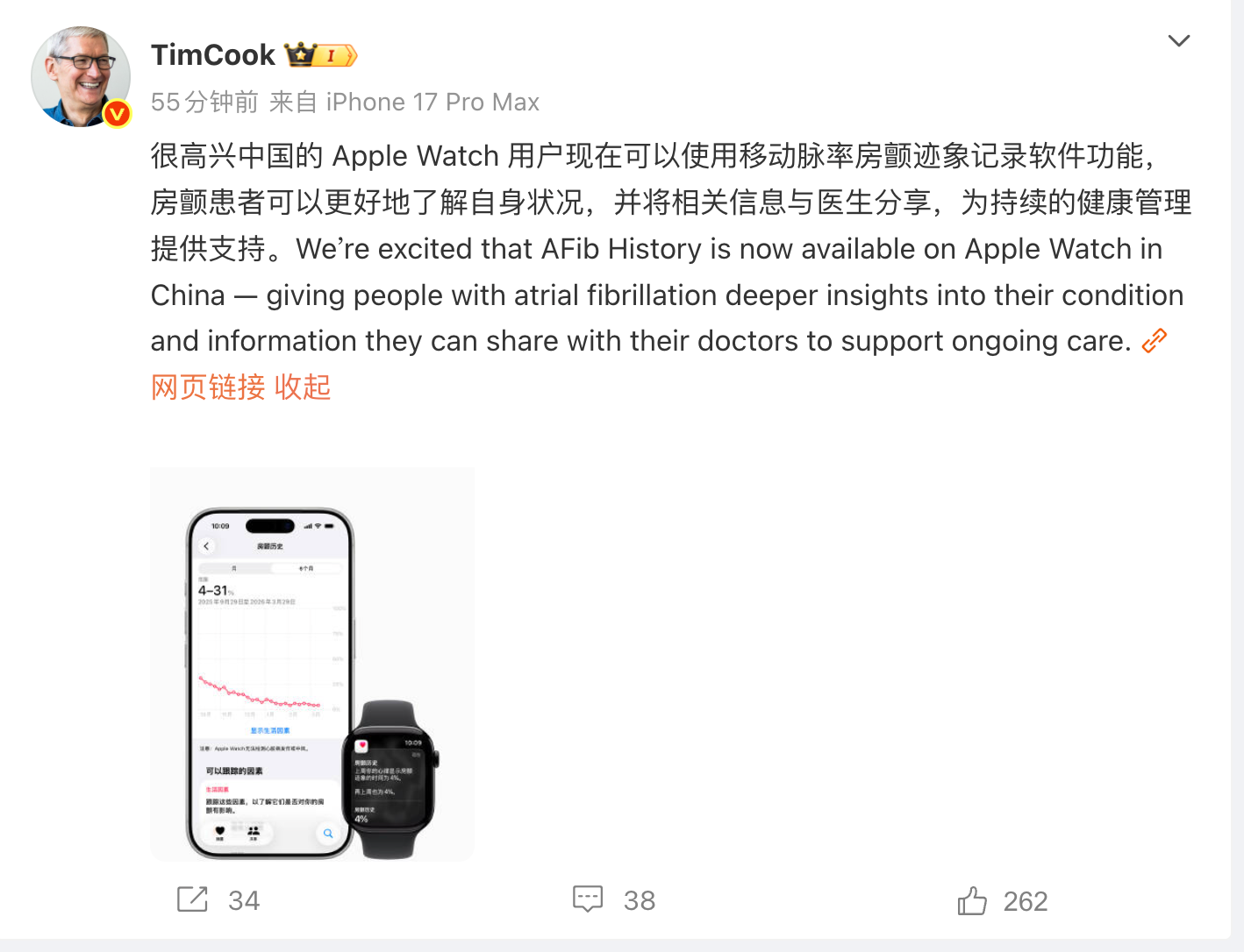 凤凰网科技讯 3月17日,苹果CEO库克发文宣布,中国的Apple Watch用户现在可以使用移动脉率房颤迹象记录软件功能,房颤患者可以更好地了解自身状况,并将相关信息与医生分享。