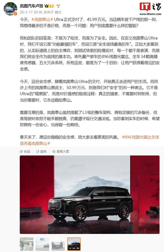 IT之家 3 月 17 日消息,在今天的岚图泰山技术焕新发布会上,全新一代 896 线激光雷达旗舰 SUV —— 岚图泰山 Ultra 量产交付,同时岚图泰山黑武士也正式上市,两车均采用华为乾崑智驾四激光方案,售价 45.99 万元 / 50.99 万元。