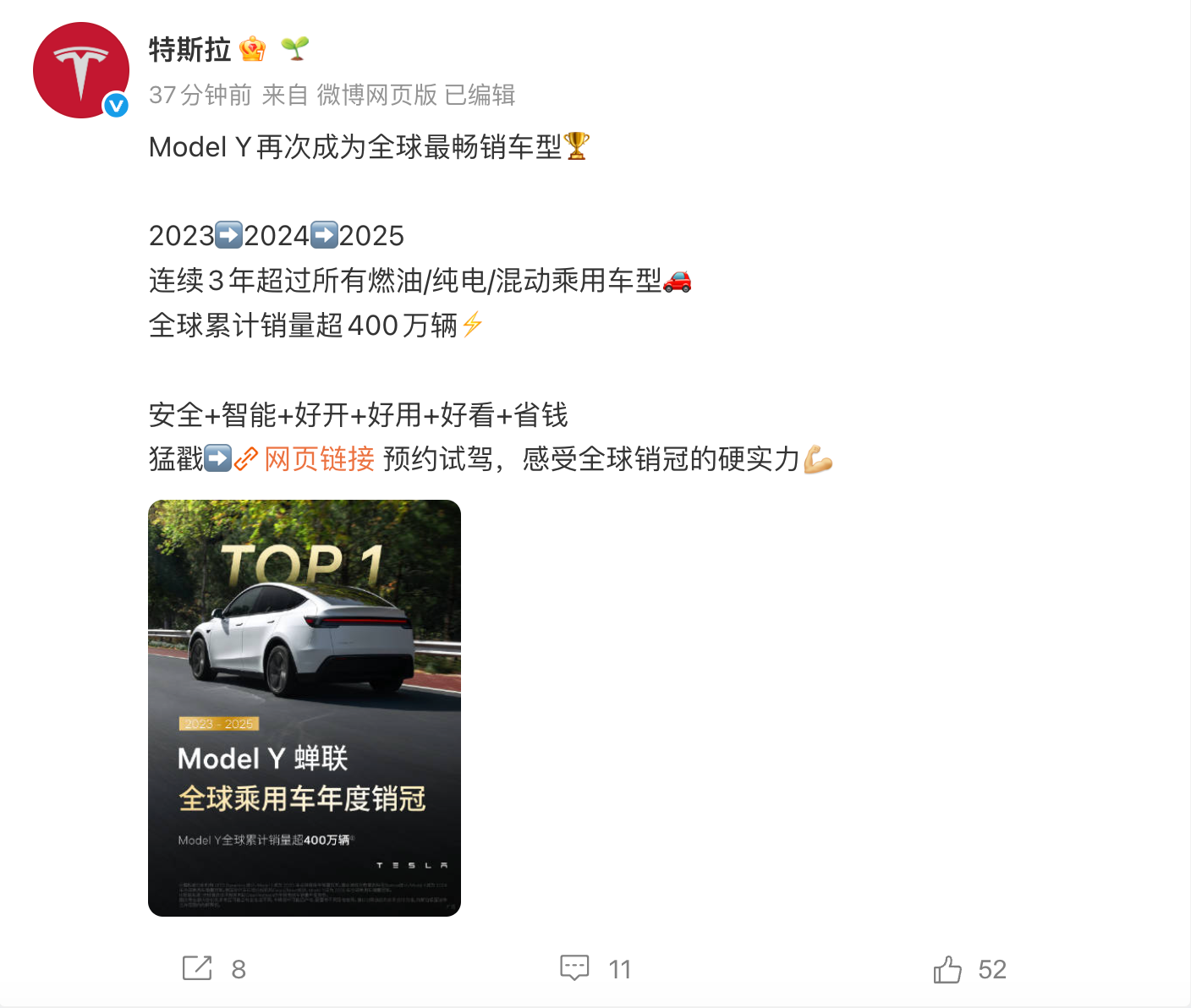特斯拉:Model Y连续三年成为全球最畅销车型,累计销量超400万辆 凤凰网科技讯 3月18日,特斯拉宣布,Model Y连续3年成为全球最畅销车型,全球累计销量超过400万辆。 去年的12月31日,马斯克在X上发文:“特斯拉Model Y现已正式连续第三年成为全球最畅销汽车。”随后,特斯拉官方账号转发了该条内容,并附文强调其“全球最畅销车型”的地位。 2023年以来,Model Y一直表现强劲,凭借其性价比高昂以及实用性、性能和科技的卓越结合,超越了丰田RAV4和卡罗拉等传统领先车型。Model Y还被誉为路上最安全的车辆之一,是中国等关键市场家庭的理想选择。 Published by 风君子 独自遨游何稽首 揭天掀地慰生平 View all posts by 风君子