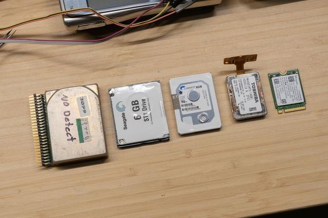 从左到右:HP Kittyhawk 1.3 英寸(20MB)、希捷 ST1 1 英寸 CF(6GB)、Cornice 8GB 1 英寸(8GB)、东芝 MK4001MTD 0.85 英寸(4GB),以及一块 M.2 2230 SSD(128G)作为尺寸参考