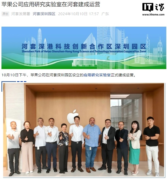 据IT之家 2024 年 10 月报道,河套深港科技创新合作区深圳园区发展署宣布,苹果公司在河套深圳园区设立的应用研究实验室正式建成运营,研究方向为 iPhone、iPad、Apple Vision Pro 等产品可靠性、质量和材料分析测试。