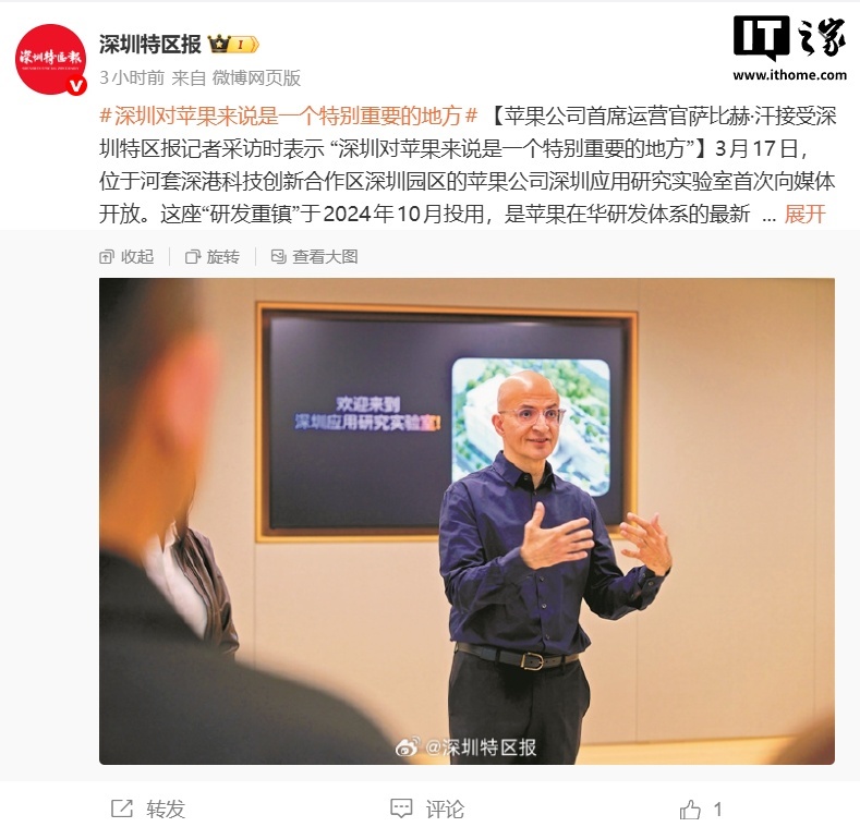 苹果公司首席运营官萨比赫 · 汗(Sabih Khan)表示:“我们最初的供应链就是在深圳建立的,深圳对我和苹果来说都是一个特别重要的地方。”