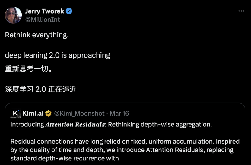 这也是为什么 Jerry Tworek 会说出「深度学习 2.0」这样的判断。当然不是说 Attention Residuals 这篇论文就能颠覆一切,更多是它代表了一种方法论的回归:不再满足于在已有框架上修修补补,去重新审视那些被所有人当作「已解决问题」的基础设施。