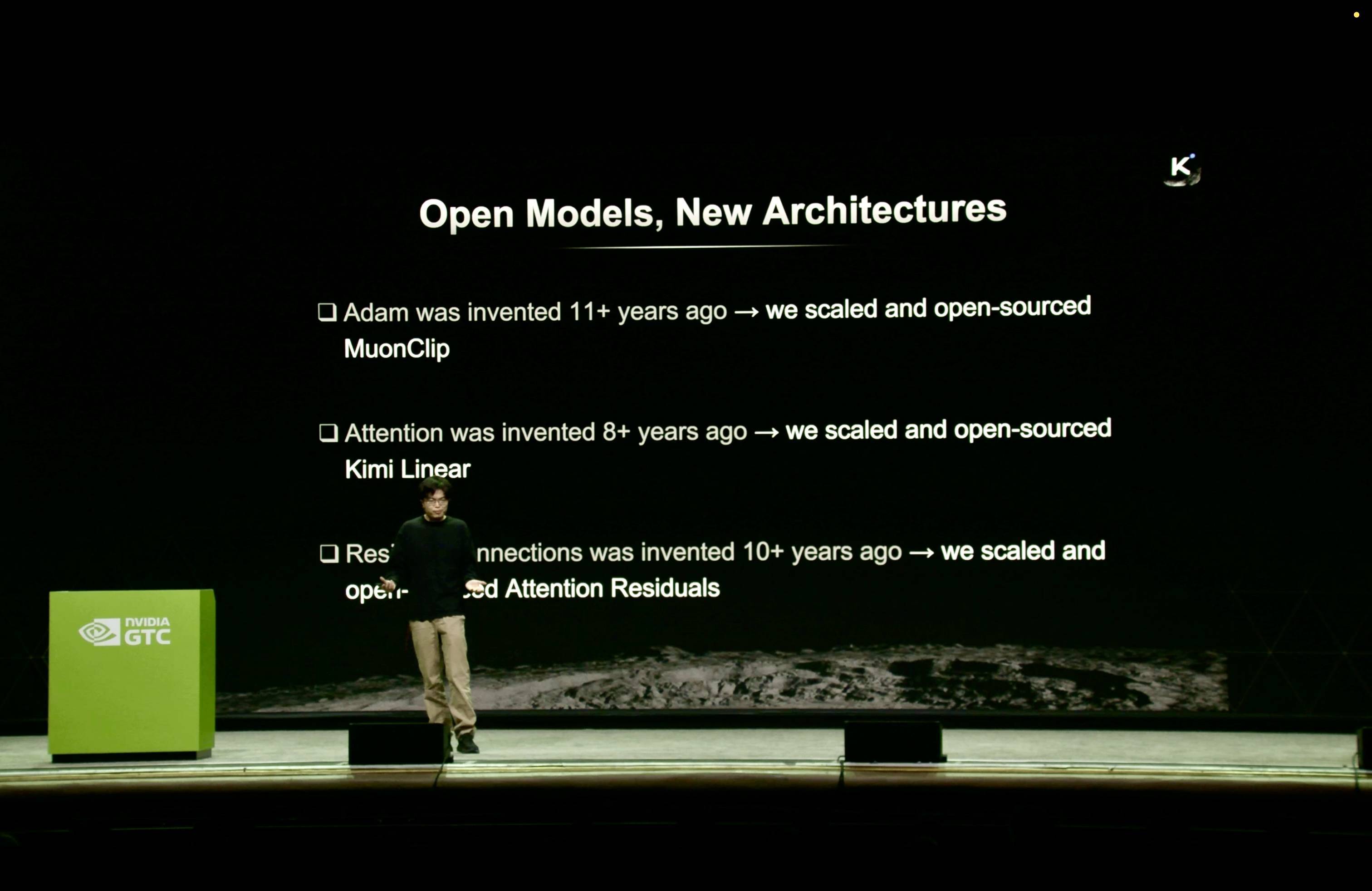 今天凌晨,Kimi 创始人杨植麟在 GTC 2026 演讲中提到:「行业目前普遍使用的很多技术标准,本质上是八九年前的产物,正逐渐成为 Scaling 的瓶颈。」