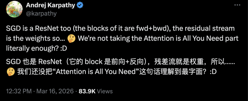 Karpathy 那句「Attention is All You Need 还没被理解透」的感慨,大概也是这个意思。