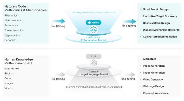 值得注意的是,BioMap采用的是类似“AI for Science基础模型”的整体架构:底层以多组学数据(基因组、转录组、蛋白组等)作为训练基础,中间通过预训练+微调构建统一表示,上层再针对具体科研与工业场景进行任务适配。这一思路与当前通用大模型“预训练—对齐—应用”的路径类似,但数据与任务空间更加复杂。