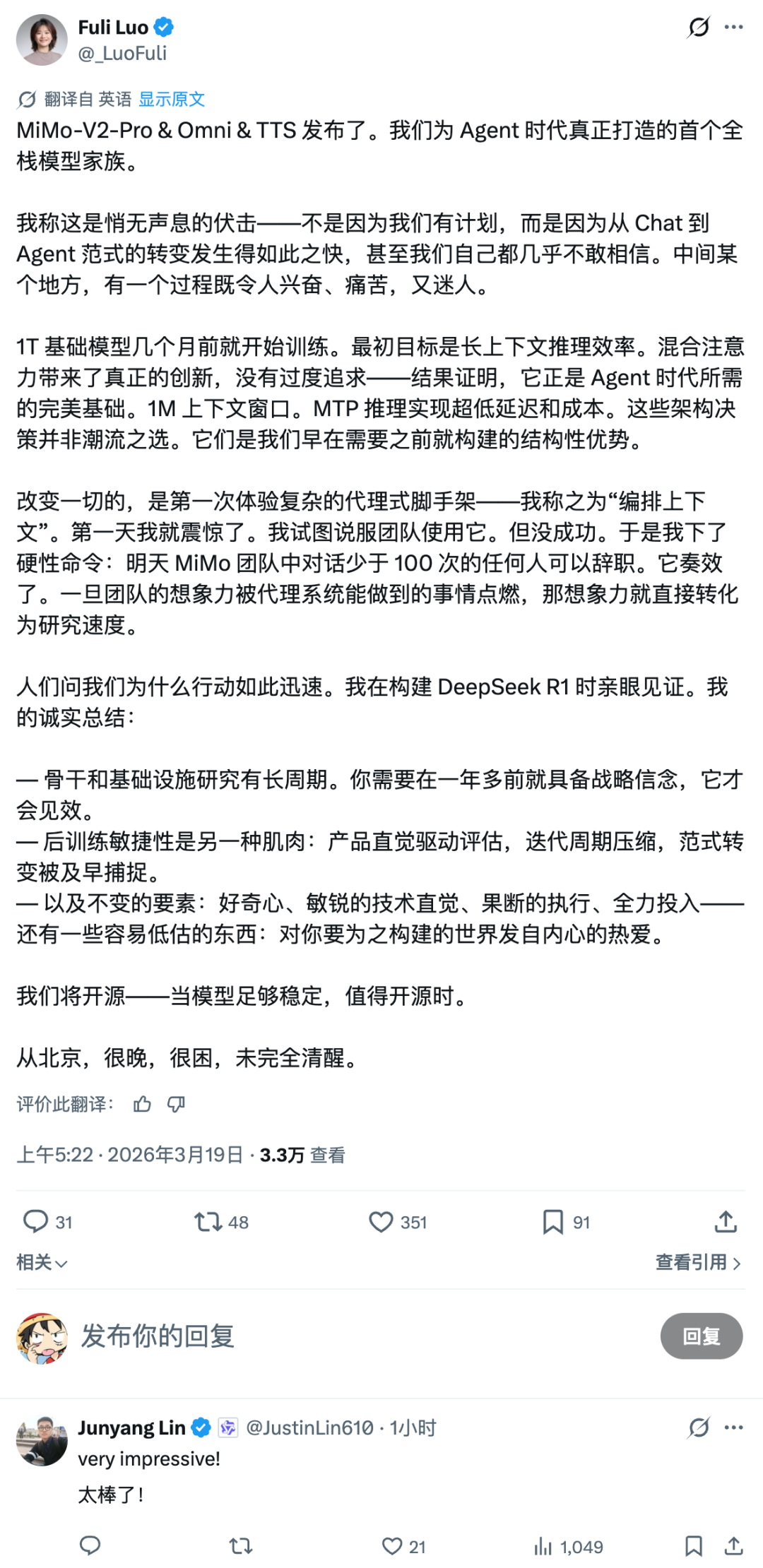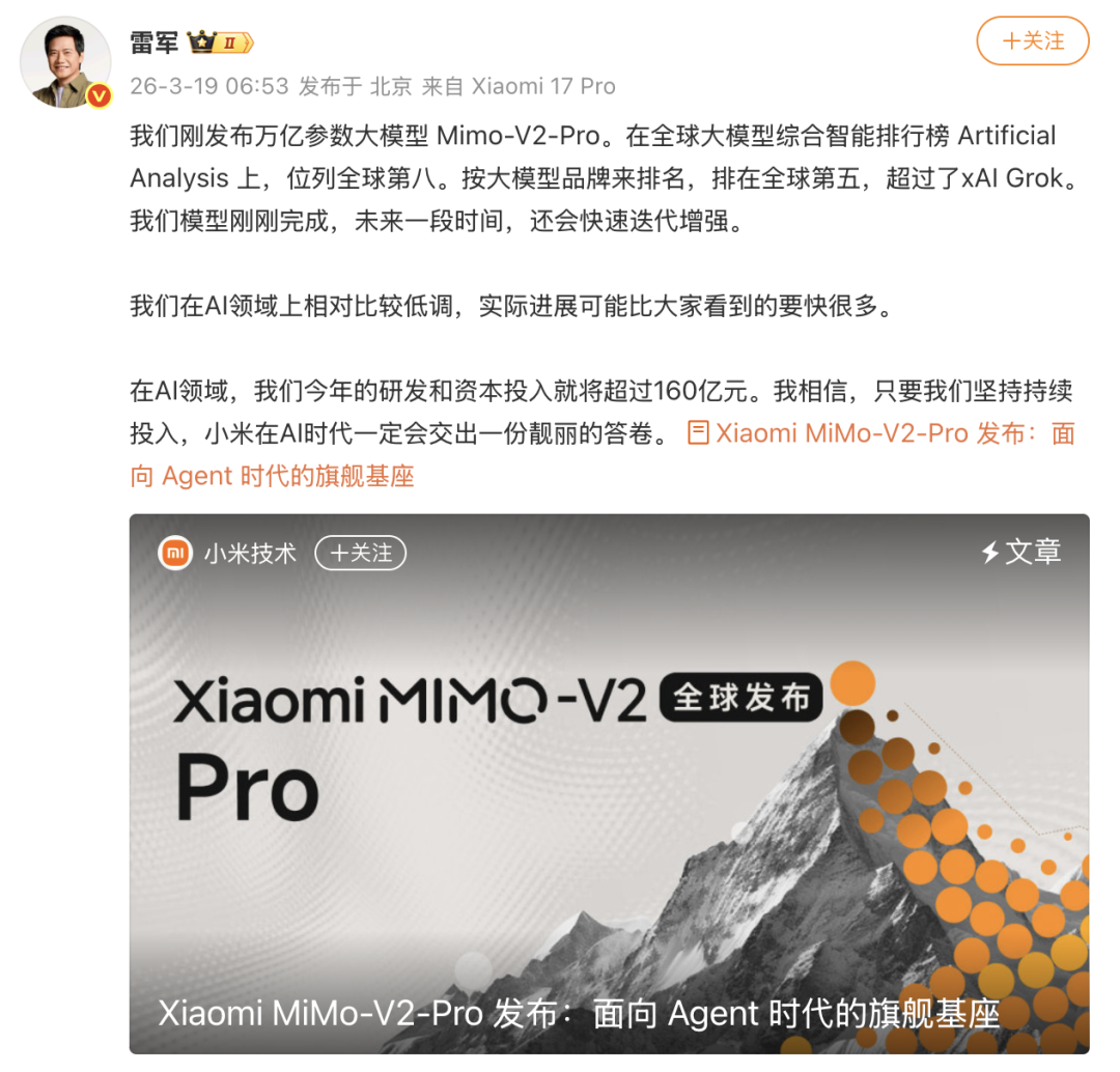 就在刚刚,小米官方正式宣布,Hunter Alpha 和 Healer Alpha 均为小米 MiMo-V2 系列大模型的早期内测版本。谜底揭晓的同时,小米 MiMo 大模型负责人罗福莉也在 X 平台公开认领。