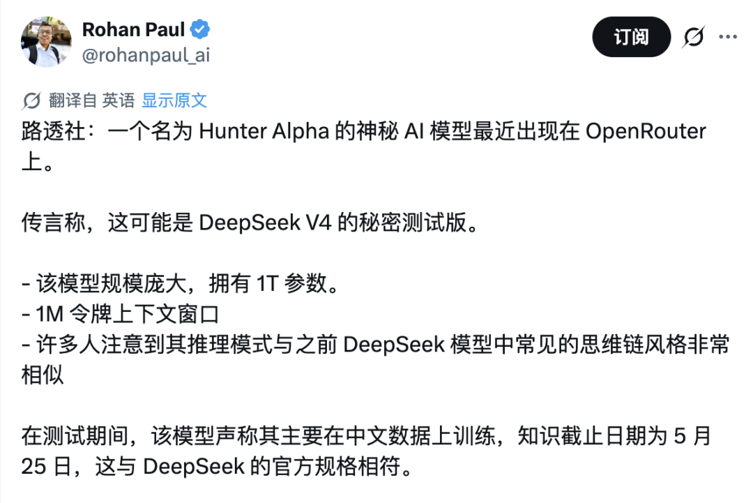 其中,Hunter Alpha 更是多天登顶日榜,累计调用量突破 1T tokens。社区开始议论。最主流的猜测指向 DeepSeek,认为这是 DeepSeek V4 的内测版本。