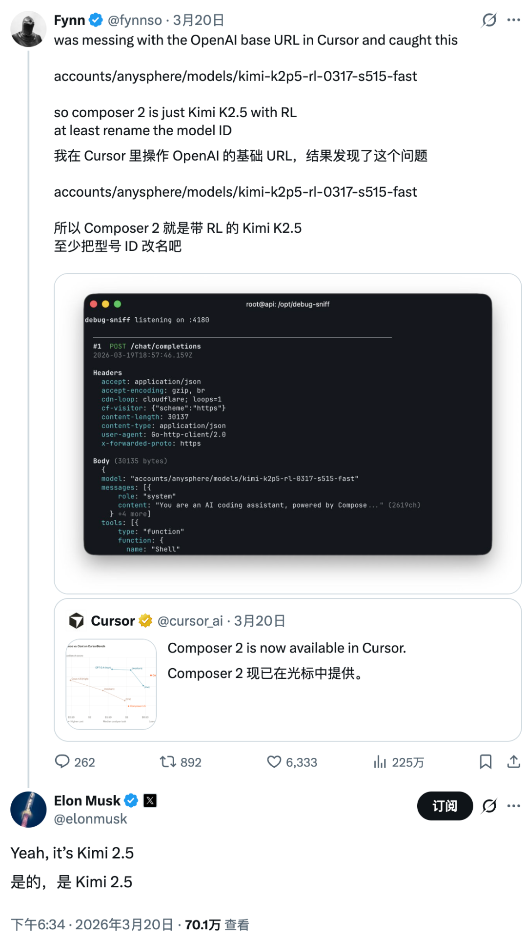 结果没过 24 小时,一个叫 Fynn 的网友在 Cursor 里翻 API 配置时,翻出了一串模型 ID:accounts/anysphere/models/kimi-k2p5-rl-0317-s515-fast,发现这个所谓的自研模型其实是「带 RL 的 Kimi K2.5」。