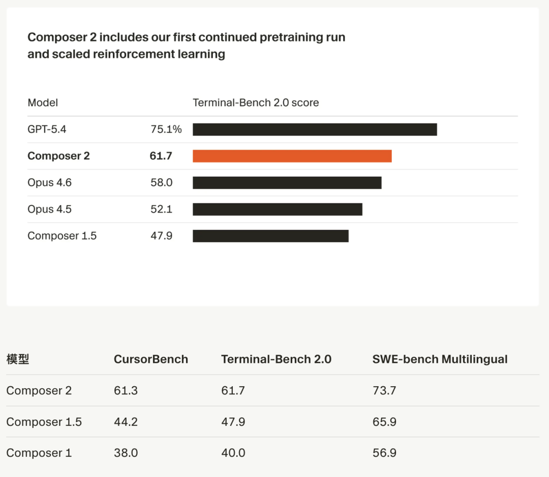 内部基准 CursorBench 得分从上一代的 44.2 跳升至 61.3,直接超过 Claude Opus 4.6 的 58.2,无限逼近 GPT-5.4 Thinking 的 63.9。