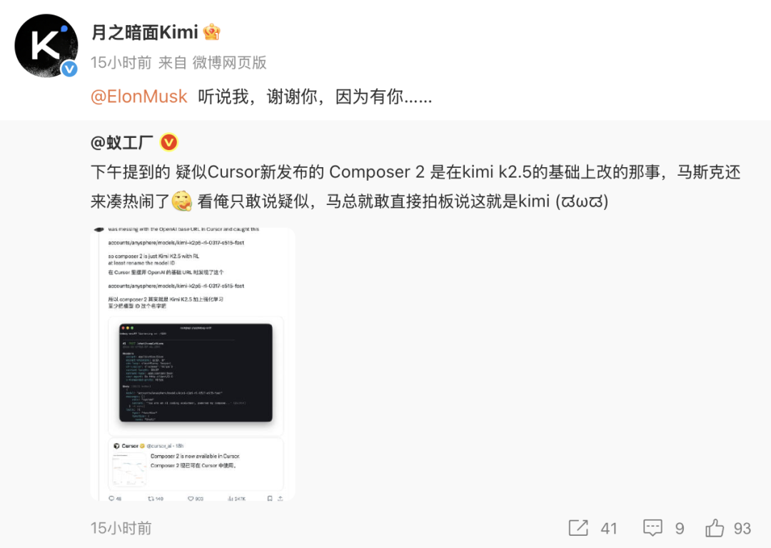 截图一发,评论区沸腾了。马斯克也现身评论区默默补刀:「Yeah, it’s Kimi 2.5」。有趣的是,针对马斯克的评论,kimi 今天也在中国社交媒体上表示感谢并回复马斯克:「听说我,谢谢你,因为有你」。