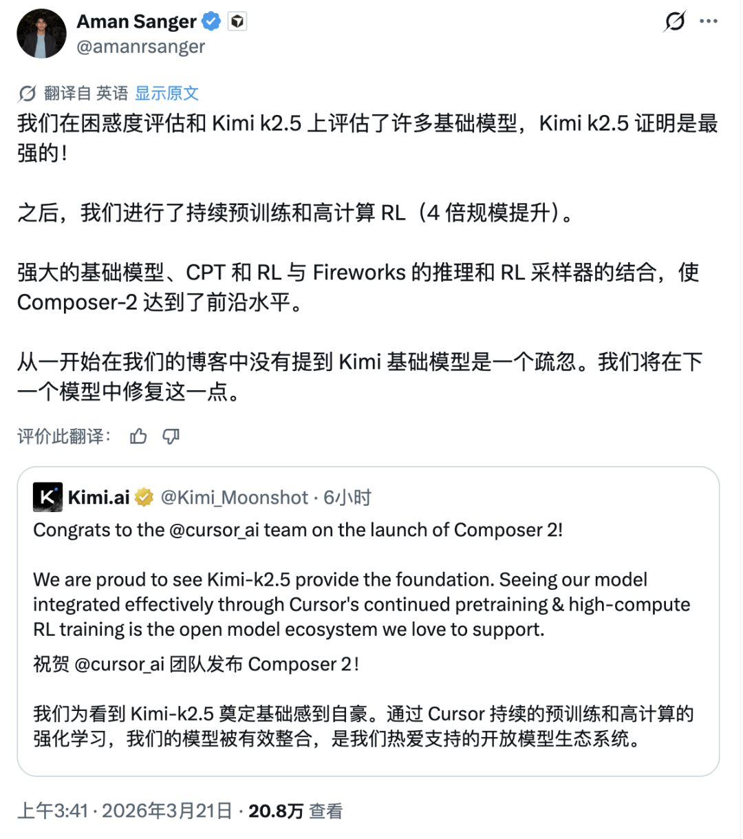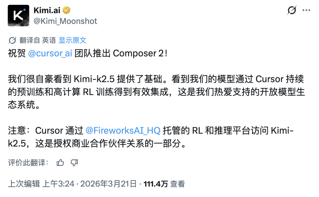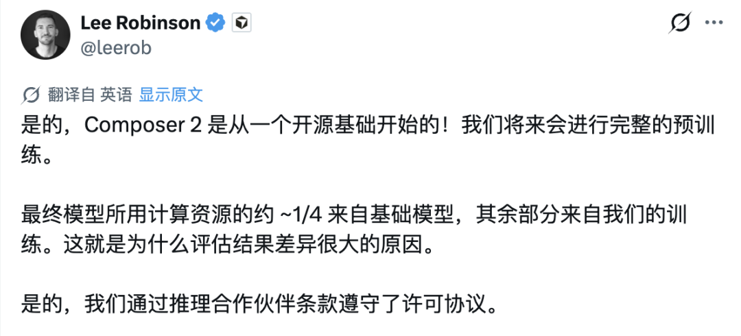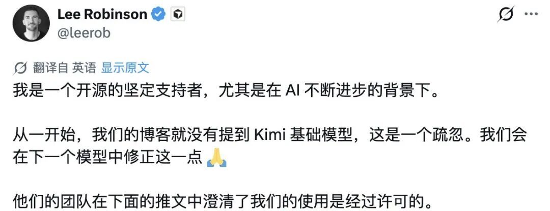 今天凌晨,Cursor AI 教育负责人 Lee Robinson 发文承认,一开始没提 Kimi 基座「确实是个疏忽」,并强调使用已通过推理合作伙伴 Fireworks 获得了合规授权。