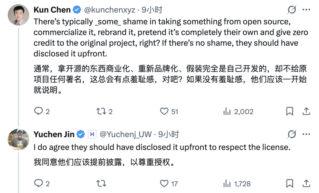 但也有人发声质疑。一家估值 500 亿美元、年化收入破 20 亿的硅谷明星公司,在最高光的发布时刻,对模型基座来源只字不提,这种「被抓包才承认」的做法,吃相实在太难看。