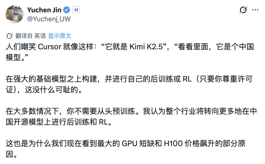 而风波的核心最终落在信息透明度上,而非版权违规。有网友替 Cursor 说话:在强基座上做预训练和 RL 本就是行业惯例,整个行业都在往这个方向走,这也是当下 GPU 严重短缺、H100 价格飙升的原因之一。