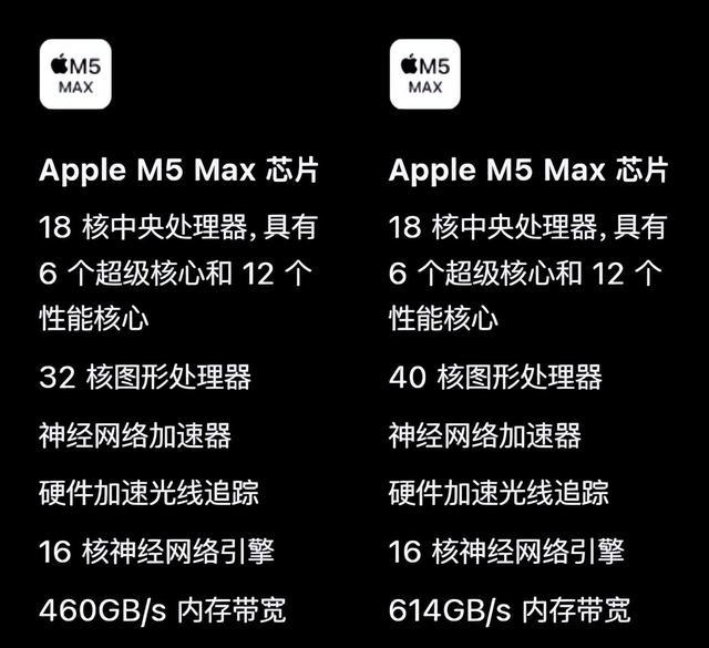 这颗 M5 Max 芯片,可不是 M5 的简单升级。核心架构对比 M5,彻底放弃了 E核,转而使用超级核心 + 性能核心的全大核设计,CPU 规模更是来到了 6 + 12 共 18 核心。