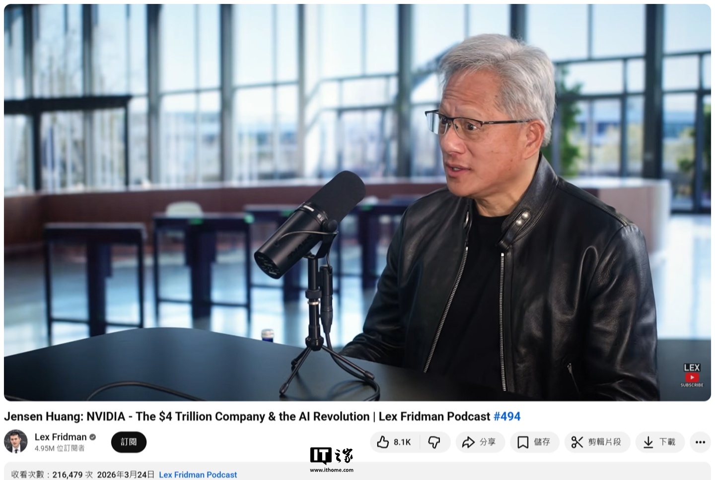 IT之家 3 月 24 日消息,英伟达创始人兼 CEO 黄仁勋今天出席《Lex Fridman》视频播客,再次回应 DLSS 5 争议。