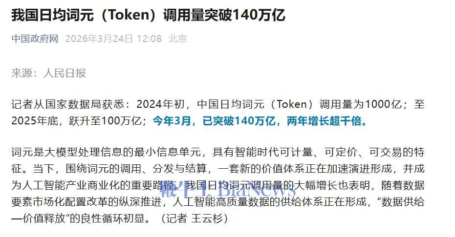今天,中国政府网转发人民日报援引自国家数据局的文章显示,我们日均词元调用量突破140万亿。