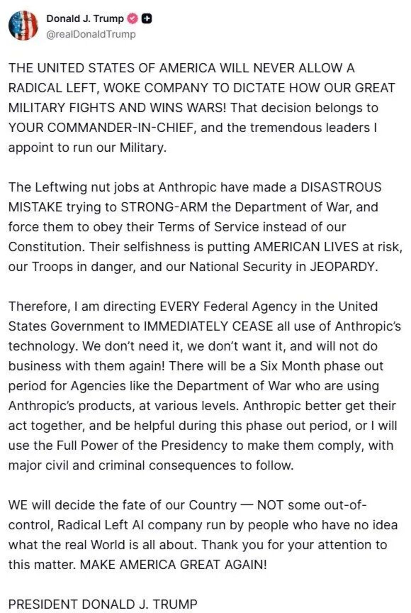 2月27日,特朗普在社交媒体上发文,指责Anthropic试图用服务条款勒索五角大楼,下令所有联邦机构立即停止使用Anthropic的技术。随后,国防部长将其正式指定为“国家安全供应链风险”,这意味着任何与美军有业务的承包商不得与Anthropic开展商业活动。
