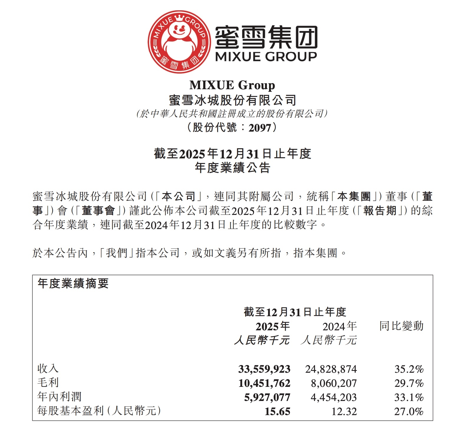 蜜雪集团于昨日午间发布 2025 年度业绩公告。总体来看: