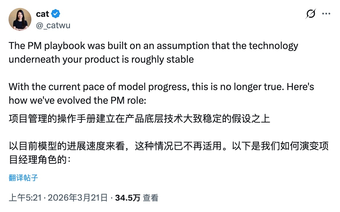 近日,Claude Code 产品经理 Catherine Wu(@_catwu)在 X 发文,分享了她在 AI 模型高速迭代背景下产品经理角色的演变方式。