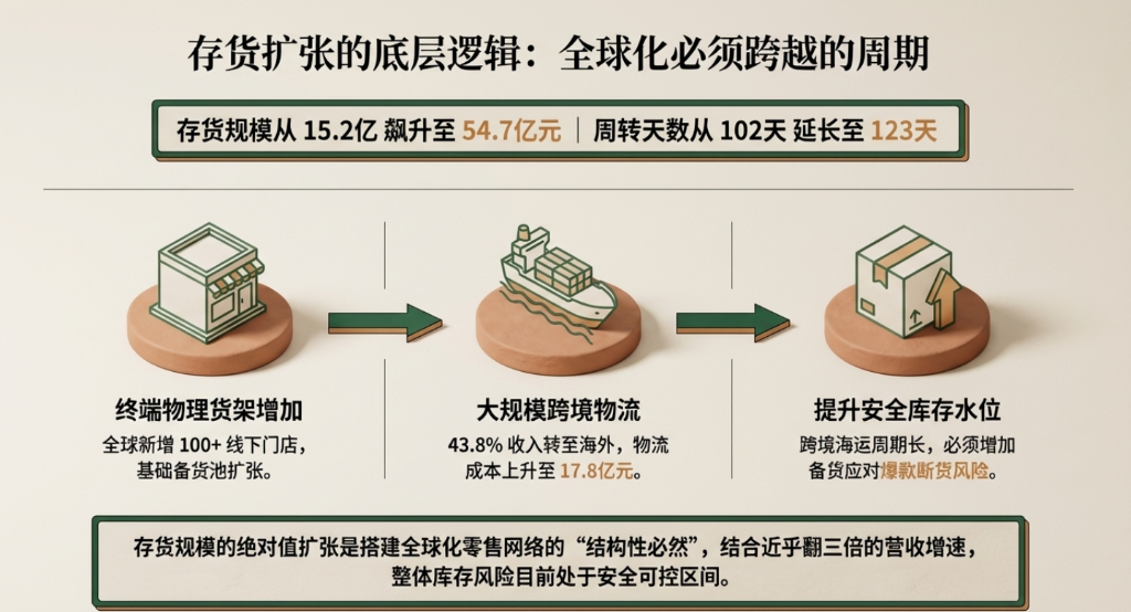 一是海外业务占比提升,跨境货运周期较长,需要维持更高的安全库存;二是全球新增门店超过100家,备货需求相应增加。虽然存货的绝对规模扩张较快,但结合大幅增长的收入规模,暂未见明显库存风险。
