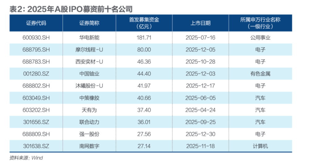A股市场上,分行业来看,电子行业以365亿元的募资金额,高居首位。该行业的细分行业中,半导体以275亿元的IPO募资额成为主力军。2025年,共计有10家半导体公司登陆A股,摩尔线程(688795.SH)、西安奕材(688783.SH)、沐曦股份(688802.SH)募资金额均超40亿元,分居行业前三。