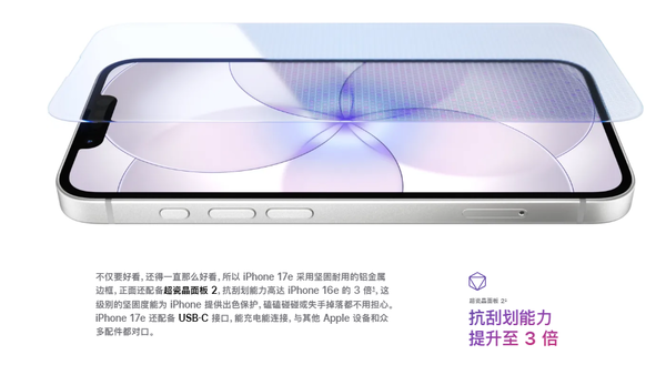 屏幕方面,iPhone 17e配备了一块6.1英寸超视网膜XDR显示屏,峰值亮度1200nit,户外可视性优秀。不过它延续了刘海屏设计,刷新率依然停留在60Hz。耐用性方面,屏幕采用第二代超瓷晶面板,抗刮能力较前代提升3倍,日常磕碰无需过度担忧。