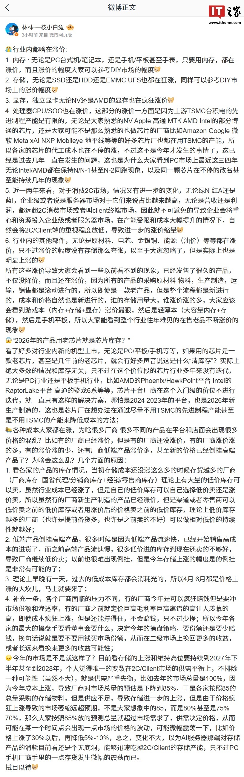 IT之家 3 月 26 日消息,荣耀中国区智慧生活业务部部长林林今日发文感叹,称行业内的原料几乎在涨价,包括内存、存储、显存、处理器 CPU / SOC 等。