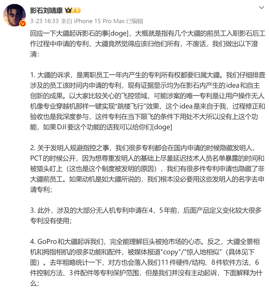 他还补了一句:什么情况下会动用专利反制?“影石公司将在专利上受到实质性阻挠没法在该品类继续推出新产品或创新,例如不能做无人机了的时候。”