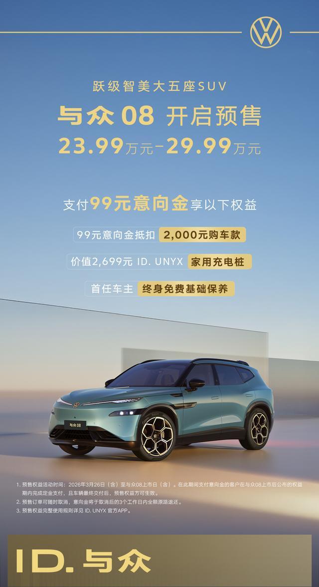 IT之家 3 月 26 日消息,今天晚间,大众汽车与小鹏汽车联合开发的首款车型 —— 中大型 SUV 与众 08 正式开启预售,价格区间为 23.99 万元-29.99 万元。