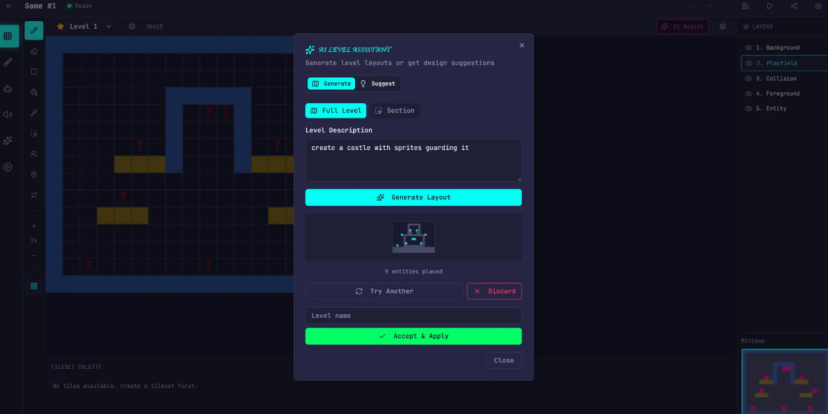 Planner将一句话提示扩展为16个功能、10个冲刺的完整规格,远超单agent尝试的范围。除了核心编辑器和播放模式,还包括精灵动画系统、行为模板、音效和音乐、AI辅助的精灵生成器和关卡设计器,以及带分享链接的游戏导出功能。